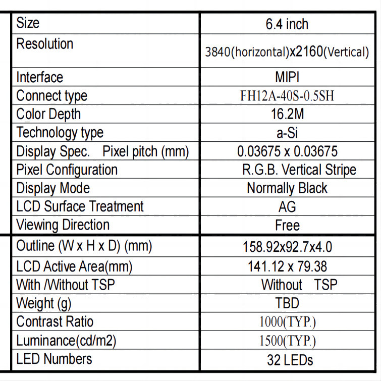 ESHX064UHD는 6.4인치 고해상도 TFT LCD 디스플레이, 3840*2160 해상도 및 MIPI 인터페이스뷰 앵글은 모든 뷰, 밝기는 1500 c/d입니다